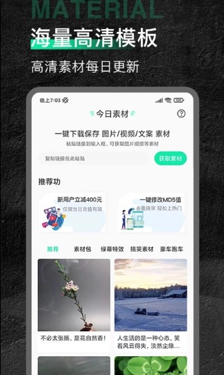 v1.0.3这里有许多视频素材可供和查看,海量素材应有尽有,无论你要什么素材,今日短视频素材都能满足你的需求 * 内涵多种学院素材,线上学习素材技巧 * 海量素材包供你选择 * 一键保存图片/视频/文案等素材 还在等什么,今日短视频素材等你来拿