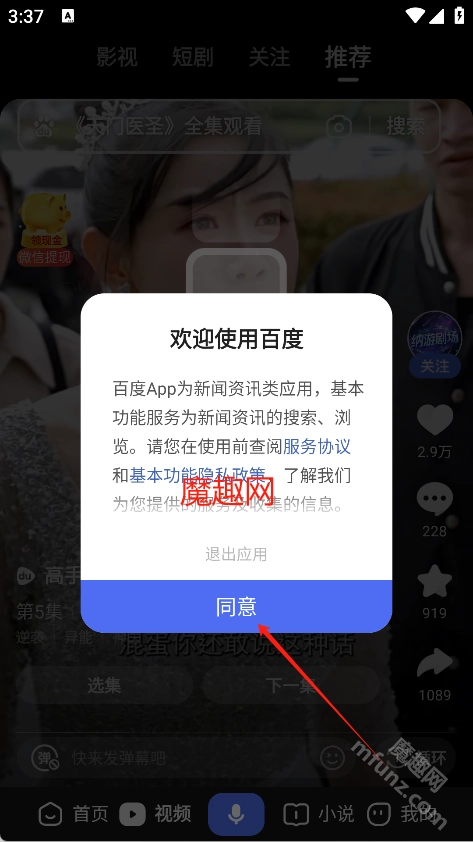 1、在手机上安装百度最新版本,点击同意进入软件