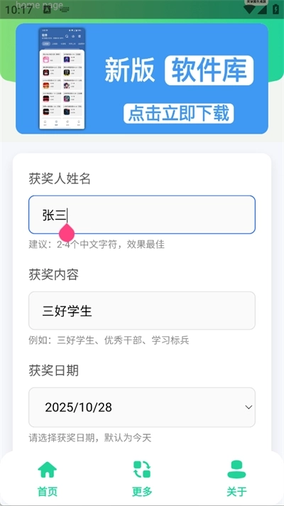 打开软件后,用户能够自行设定获奖人的姓名、获奖内容以及获奖日期。