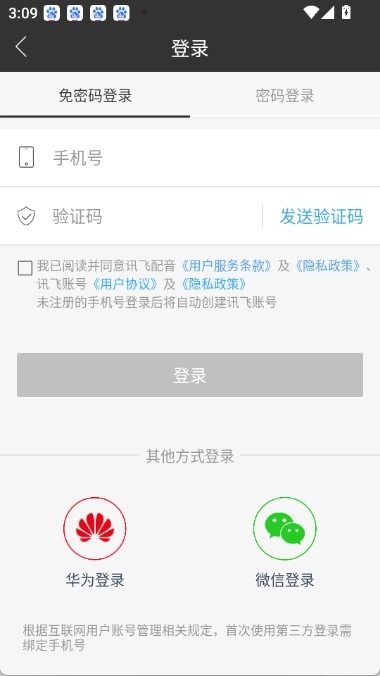 1.启动讯飞配音应用,首次打开时点击“同意并继续”按钮,随后完成账号登录操作。