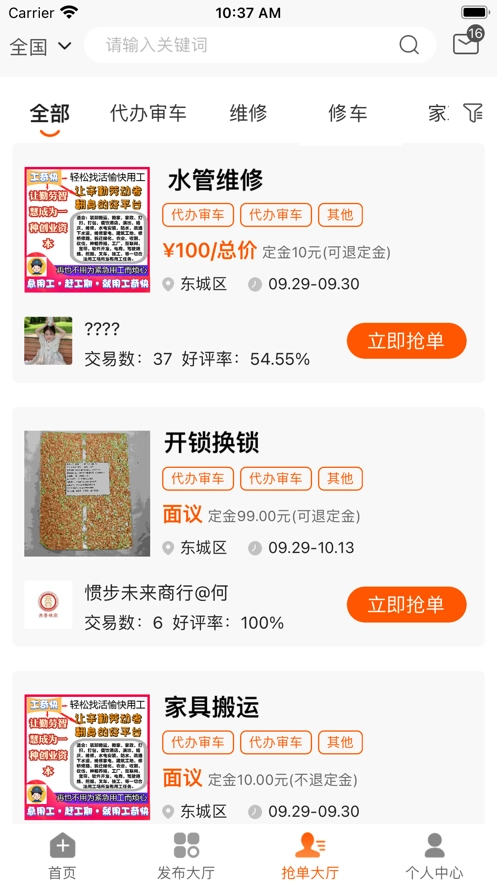 2、用户发布的所有求助信息都会第一时间更新,我们能够及时了解并快速接单;