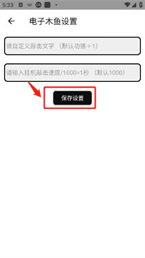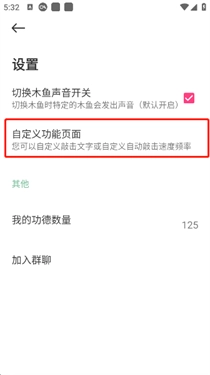 点击“设置”选项,在其中找到“自定义功能界面”,通过该功能可以切换敲木鱼过程中弹出的文字内容。