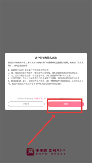 1、在【美美咖整形】的用户协议页面,点击【同意】按钮,即表示确认接受《用户协议及隐私条款》,随后进入应用流程。