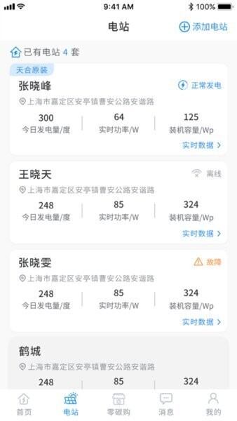 • 电站清单:包含站点位置、装机容量、实时功率以及详情查看的入口;
