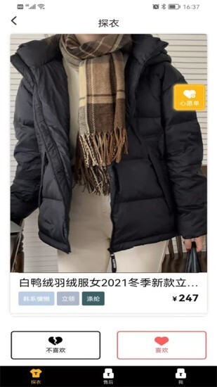 探衣——总有一款适合你。我们会为每一件精心挑选的服装产品,从风格、款式、版型、材质、颜色、价格等多个维度进行标签标注。当用户浏览衣服展示图时,左滑表示不喜欢该款式,右滑则代表喜欢。系统会依据用户的这些行为数据,为其提供实时的服装推荐服务。