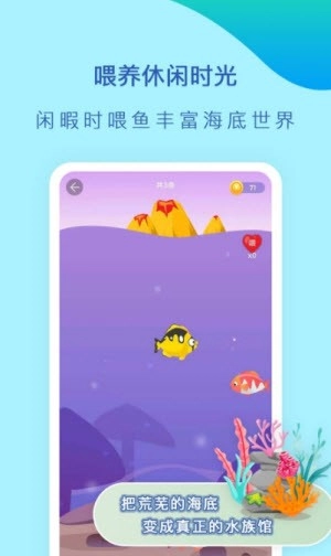 2、累计潜艇下潜的时长可获取小鱼,喂养小鱼能产生爱心,利用爱心升级海底景观,从而放松心情。