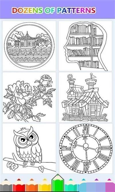 *色彩缤纷的画面:所有素材都色调饱满、画面鲜活有趣,能让用户在填色过程中体会到多样色彩所带来的愉悦感。