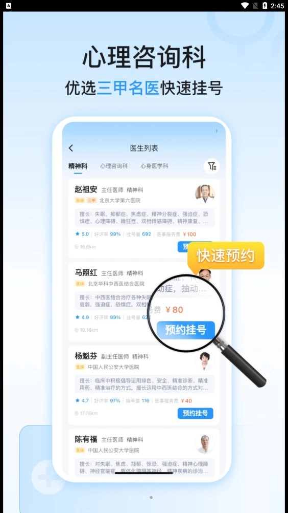 2、智能推荐:精神心理科医院挂号基于用户的就诊历史和需求,软件会给出医院、科室、医生等的智能推荐,为用户提供更好的就诊体验。