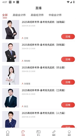 2、在直播页面中,能够查看高级会计师、高级经济师以及中级会计师相关内容的回放。
