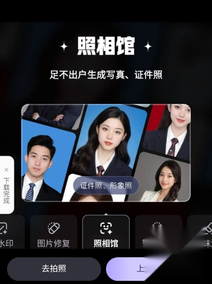 2.点击照相馆或其他功能就直接进到对应功能的编辑页面。选择去拍照或者上传图片进行照片处理。