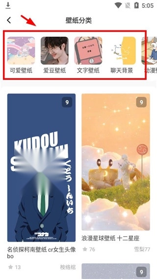 3、点击壁纸分类,查看可爱、爱豆、文字等美图资源,进行挑选。