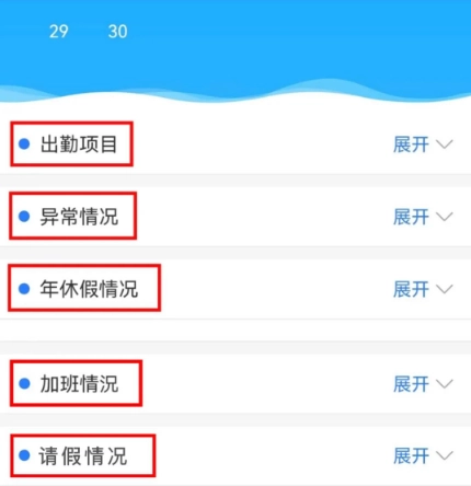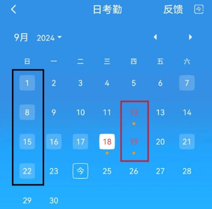 ★ 划重点!!红色方框中的红色数字(带小点)则代表考勤异常,需要大家重点查看!