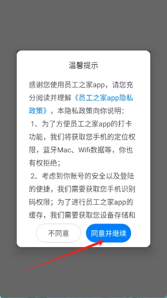1.安装并打开员工之家,点击同意并继续