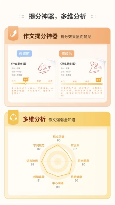 2、作文批改功能:只需拍照上传作文,就能快速获取批改结果。系统会提供涵盖多维度的全方位解析报告,同时给出专业的写作指导建议。