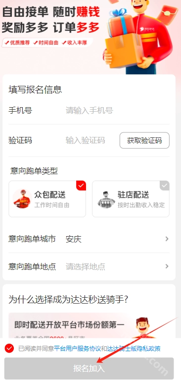 1.先并安装京东骑手配送(即达达秒送骑士),然后填写报名信息,报名加入,再上传身份证(平台会在1分钟内进行审核),注册很简单,输入手机号即可。