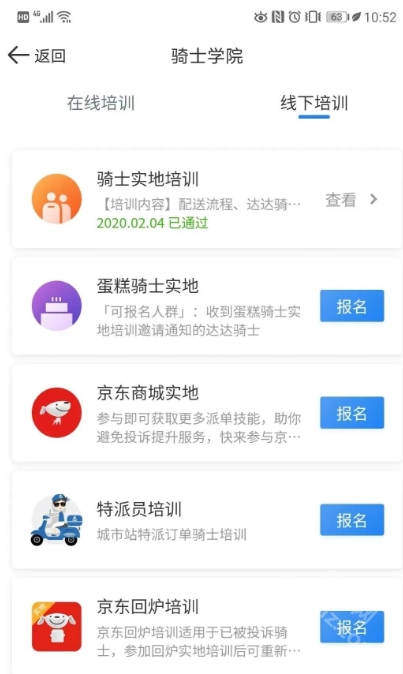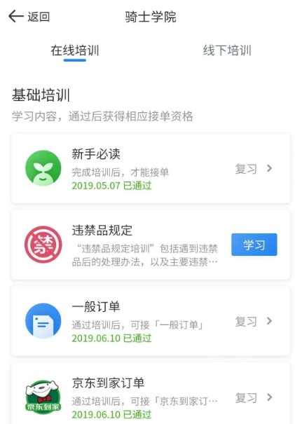 2.通过培训:审核期间您可以报名参加在线培训及实地培训,培训会详细介绍订单的配送流程及其他注意事项。注册成为达达快送骑士之后,登录达达秒送骑士,点开【骑士学院】查看,即可看到骑士培训分为【在线培训】和【线下培训】。