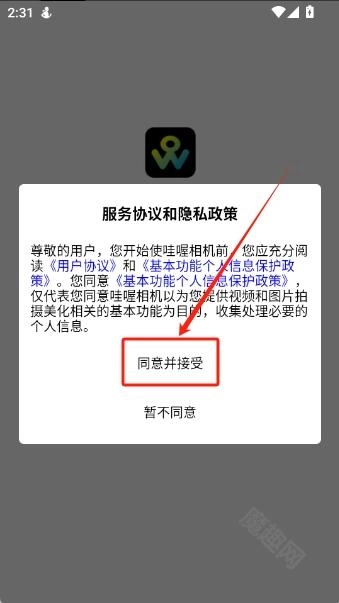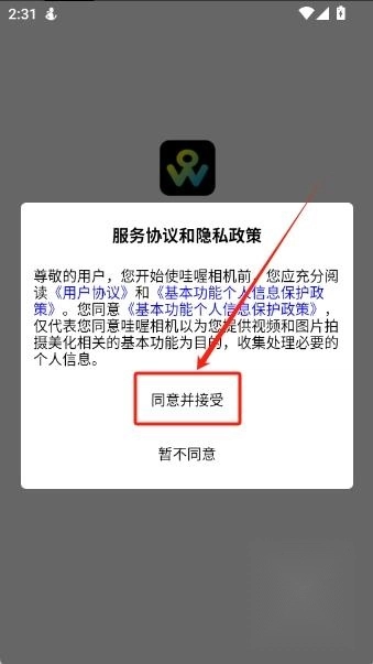 1、并打开哇喔相机,点击“同意并接受”