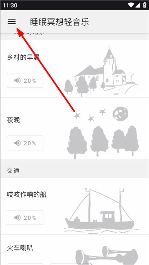 1、打开睡眠冥想轻音乐,进入音乐库页面,点击左上角“三”标志;