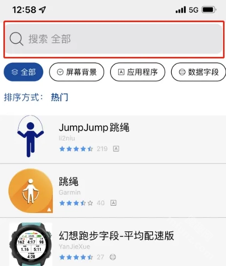 打开Connect IQ 软件,点击底部“搜索”菜单进入搜索页面,在顶部输入框中,填入表盘名称