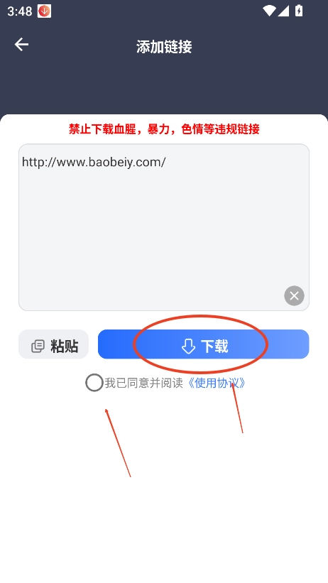 2、粘贴磁力链接后点击“”,勾选隐私政策即可开始任务。