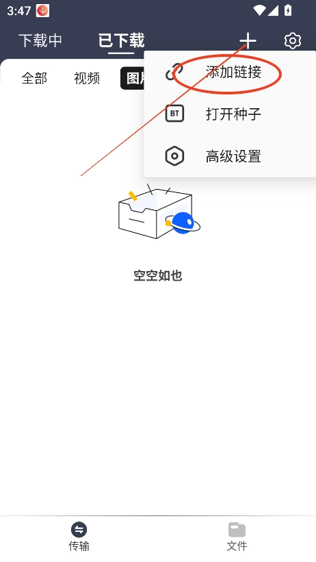 1、打开软件进入首页,点击右上角“+” 号,选择“添加链接”;