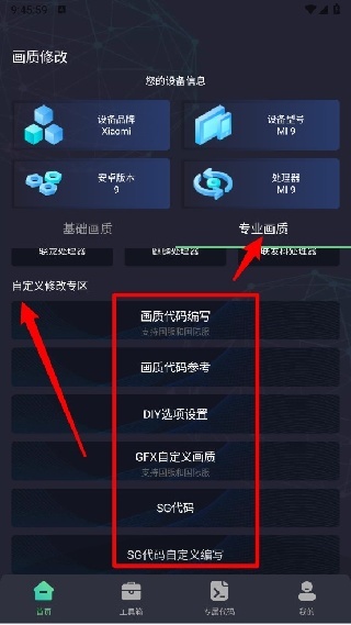 5. 切换到专业画质板块,在自定义专区能够编写画质代码和SG代码。