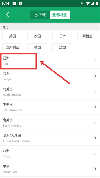 2、在当前页面点击【亚洲-Asia】选项,就能进入该区域的地图列表页面,同时页面上还会展示【美国】【泰国】等热门地区的选项。