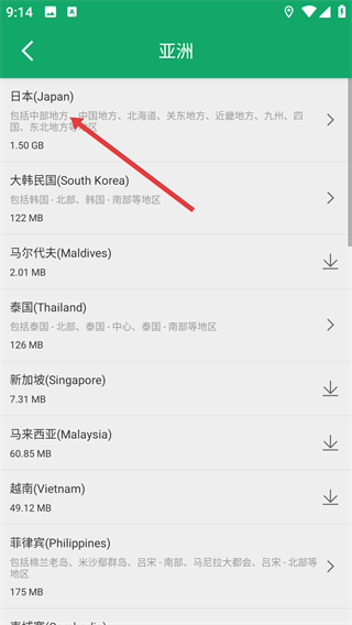3、在亚洲区域页面点击【日本-Japan】选项,就能看到该选项下涵盖的地区以及对应的大小【1.50-GB】,此外还有【大韩民国-South-Korea】等其他国家选项可供选择。