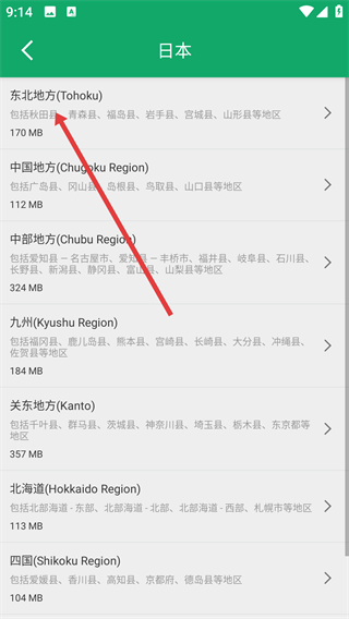 4、在日本区域页面点击【东北地方-Tohoku】选项,就能查看该区域包含的县区、大小信息【170-MB】,此外还有【中国地方-Chugoku-Region】等其他选项可供选择。