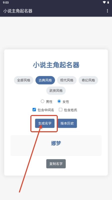 2、只需轻轻一点,软件便能迅速启动,在极短的时间内,快速生成各式各样的人物名字。