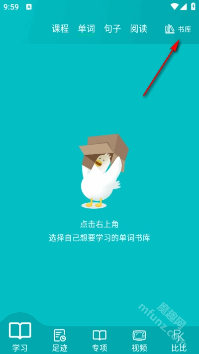 1、打开鲸奇英语软件,点击右上角书库。