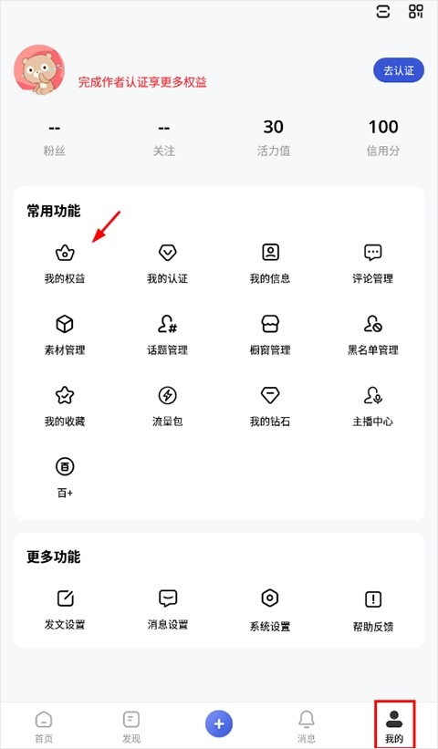 2、然后在里面点击右下角我的,在常用功能里选择我的权益。