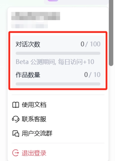 2.登录后,在个人信息区域查看初始的10个作品额度和100次对话额度