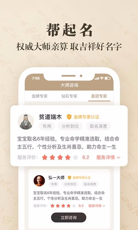 行业权威大师实时在线提供服务,助力你更精准地取名字。