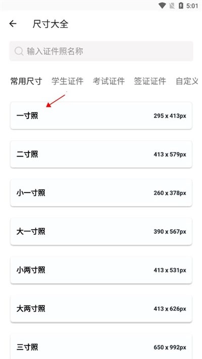 证件照尺寸:一寸、小一寸、二寸、小两寸、大一寸、三寸、五寸;