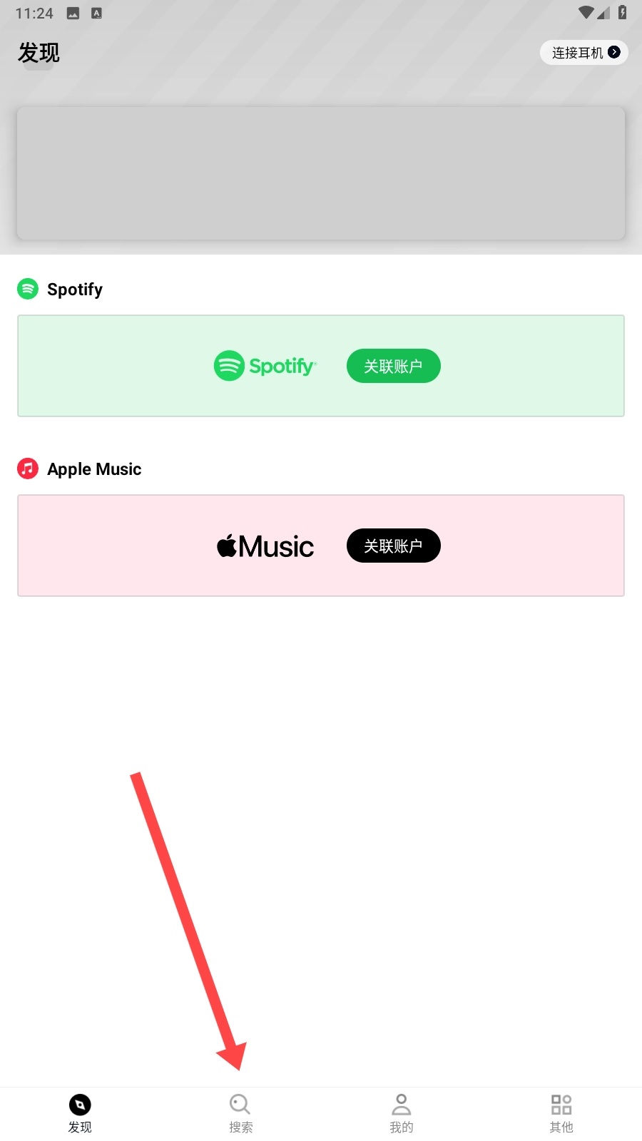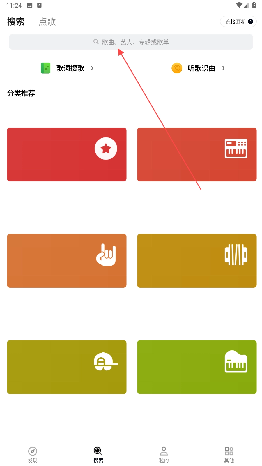 2、在搜索栏,点击【搜索】音乐,查找资源。