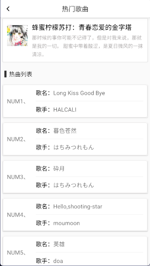 4. 热曲列表:展示热播歌曲类别,方便用户查看。