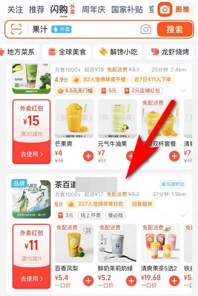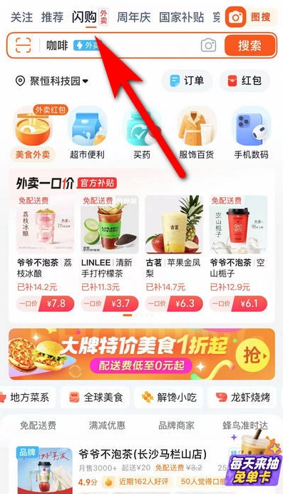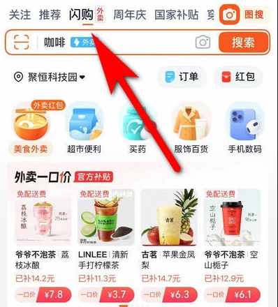 将手机淘宝更新到最新版本,打开软件进入首页就能看到“闪购”,点击就能直接进入点外卖!