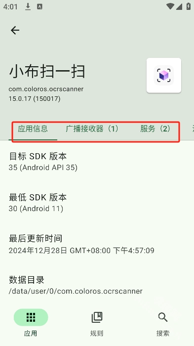 1.打开Blocker后,选择你想要管理的应用就可以进到应用的详细界面,在应用界面可以看到应用信息、广播接受器、服务、活动项、内容提供者、sdk等信息。