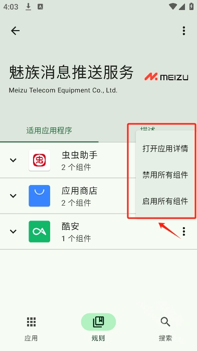 4.点击右边【...】可以打开应用详情、禁用或开启所有组件