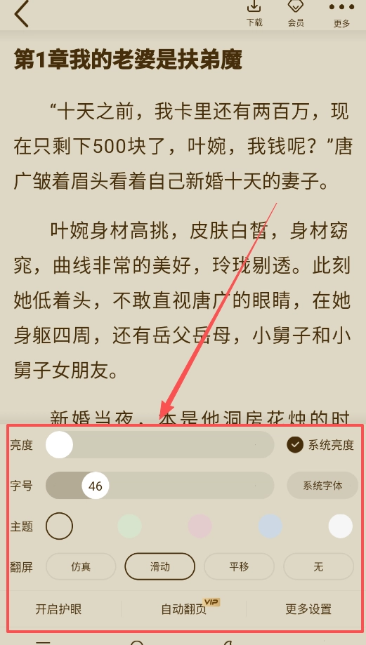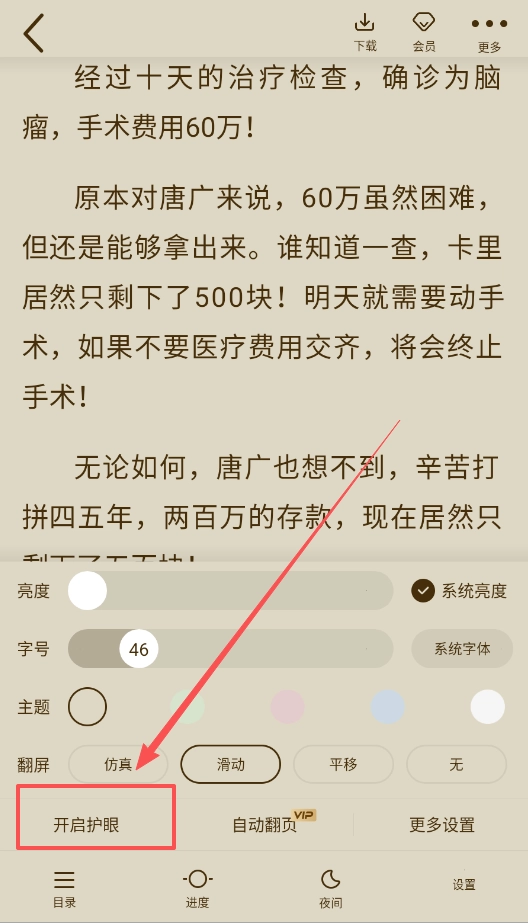3、觉得阅读体验不舒服的话,试试调整正文下方的设置选项,从系统亮度到翻页模式都能自定义,仿真翻页的质感真的很不错。