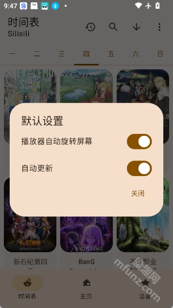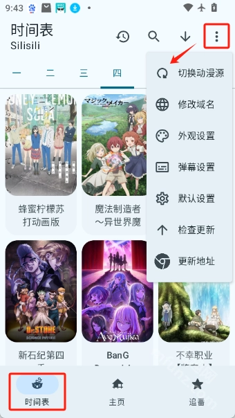 1.点击时间表右上角【...】,可以切换动漫源、修改域名、外观设置、弹幕设置、默认设置、更新地址等。