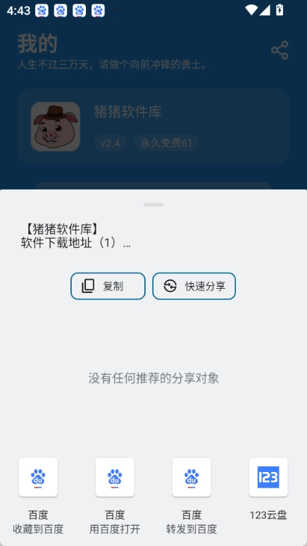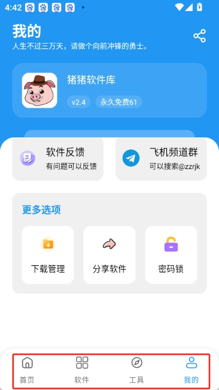 zzrjk.猪猪软件库除了以上功能外,还可以看早报,每天60秒,让我们紧跟信息潮流,更好的读懂世界,同时还可以查询qq并对qq进行绑定,支持密码锁和分享软件,如果需求高,还可以在管理中对文件进行管理。