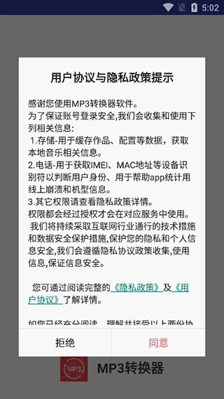 1、打开已安装的mp3转换器,首次使用时需同意用户协议。