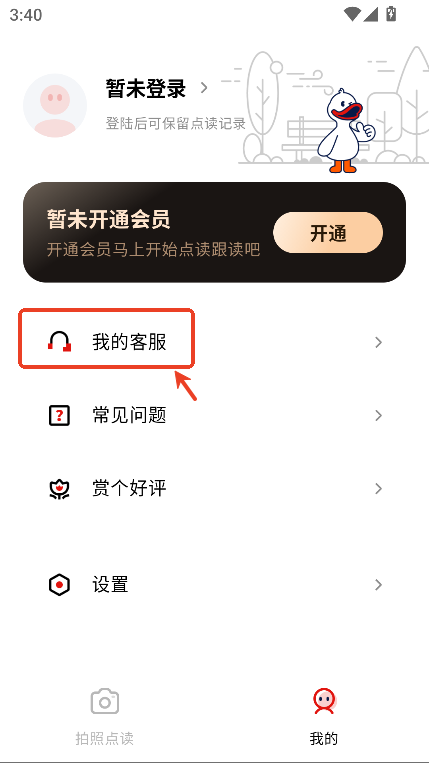 1.打开快读鸭App,在我的页面中点击我的客服