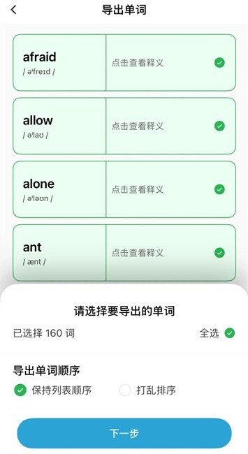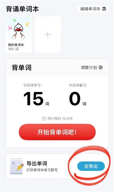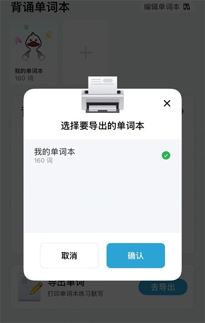 4.点击背单词区域的“导出单词”按钮,挑选需要导出的单词,然后为文件设置名称。