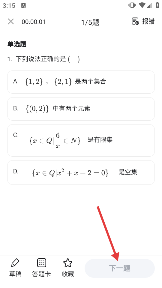 4、进入题型选择页面后,挑选对应的题型,点击【开始练习】按钮进入答题界面,完成当前题目后点击【下一题】按钮继续作答。