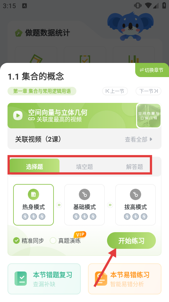 3、在章节选择页面,选择【1.1集合的概念】这一章节,随后进入题型选择页面。