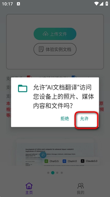 2、点击主页的“上传文件”选项,软件将请求获取手机上相应文件的权限。