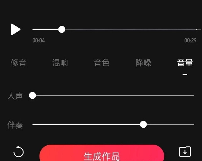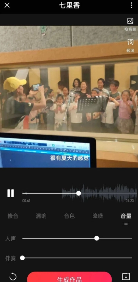 如果没有伴奏的话,同理,我们可以简单录制一次导出的时候,在调节音量页面,把人声关到最小,伴奏拉到70%左右。发布之后保存视频,就可以得到带伴奏的视频文件啦。